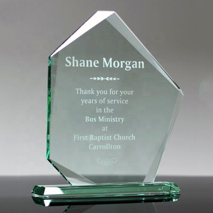 Celebrate achievements with our EcoElegance Green-Edge Crystal Awards. Crafted from environmentally friendly glass with stunning green edges, featuring precise 2D laser engravings. Perfect for recognizing excellence, milestones, or gifting sustainably—exuding sophistication and eco-consciousness. Customize for a unique, timeless keepsake.